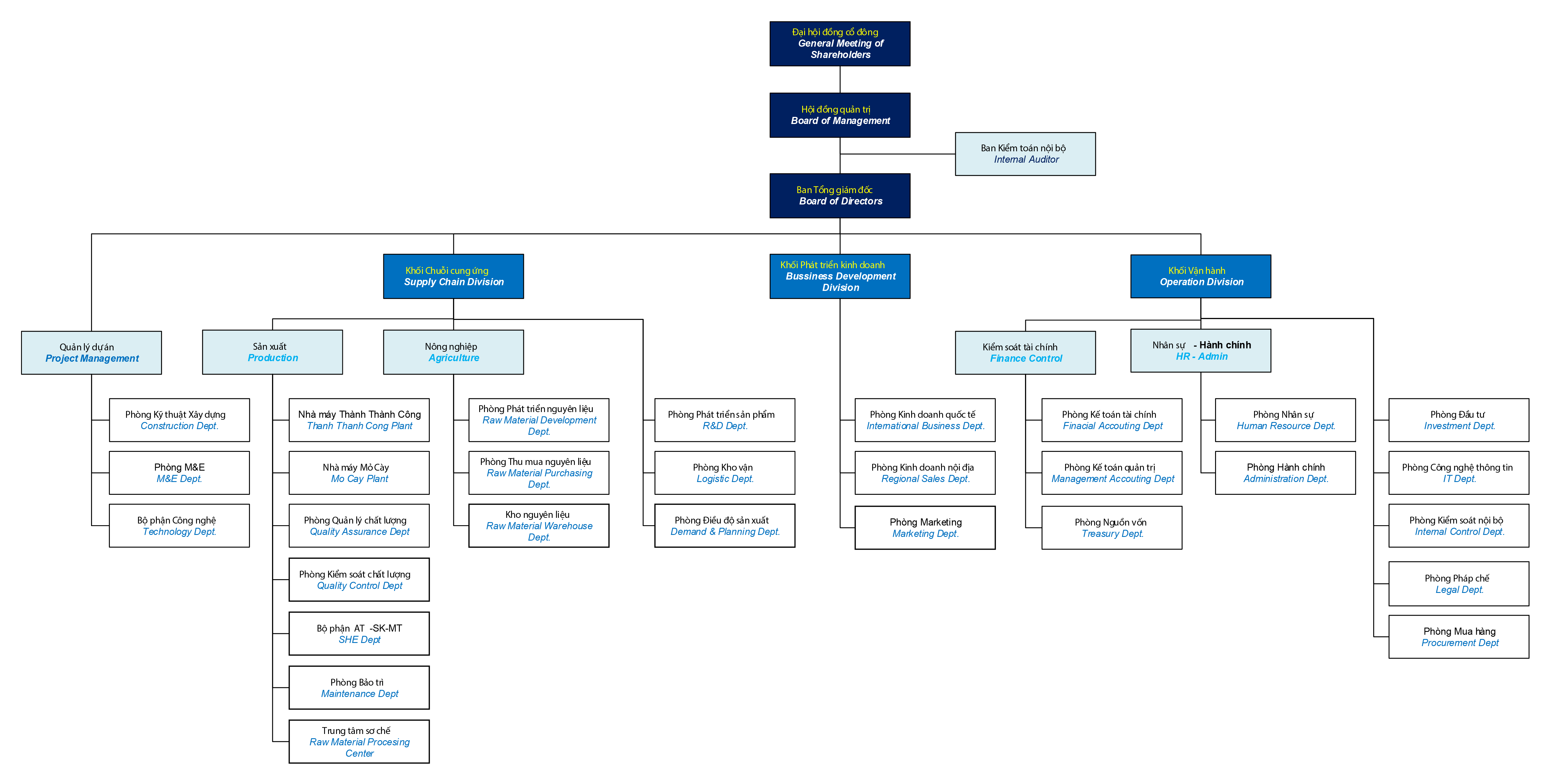 In recent years, besides focusing on resources for investment and development of infrastructure, warehouses, production equipment as well as human resource in the Company, Betrimex has been maximally expanded the operational model to bring the highest effectiveness and benefits to the whole Company. The organizational chart of Betrimex is professionally and scientifically shown as follows. Independent operation and closed relationship among departments create a sustainable and well-developed Betrimex.