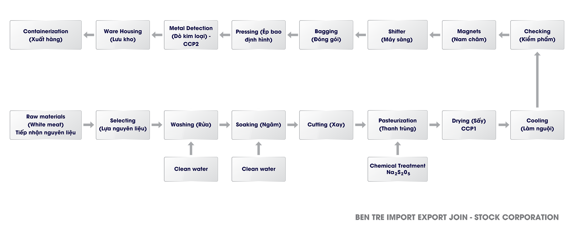 There are 2 production drylines to make desiccated coconut: Capacity of line 1: 600 – 650 kg/hour Capacity of line 2: 750 – 900 kg/hour The production process in the factory is strictly controlled and follows the hygiene and food safety standard