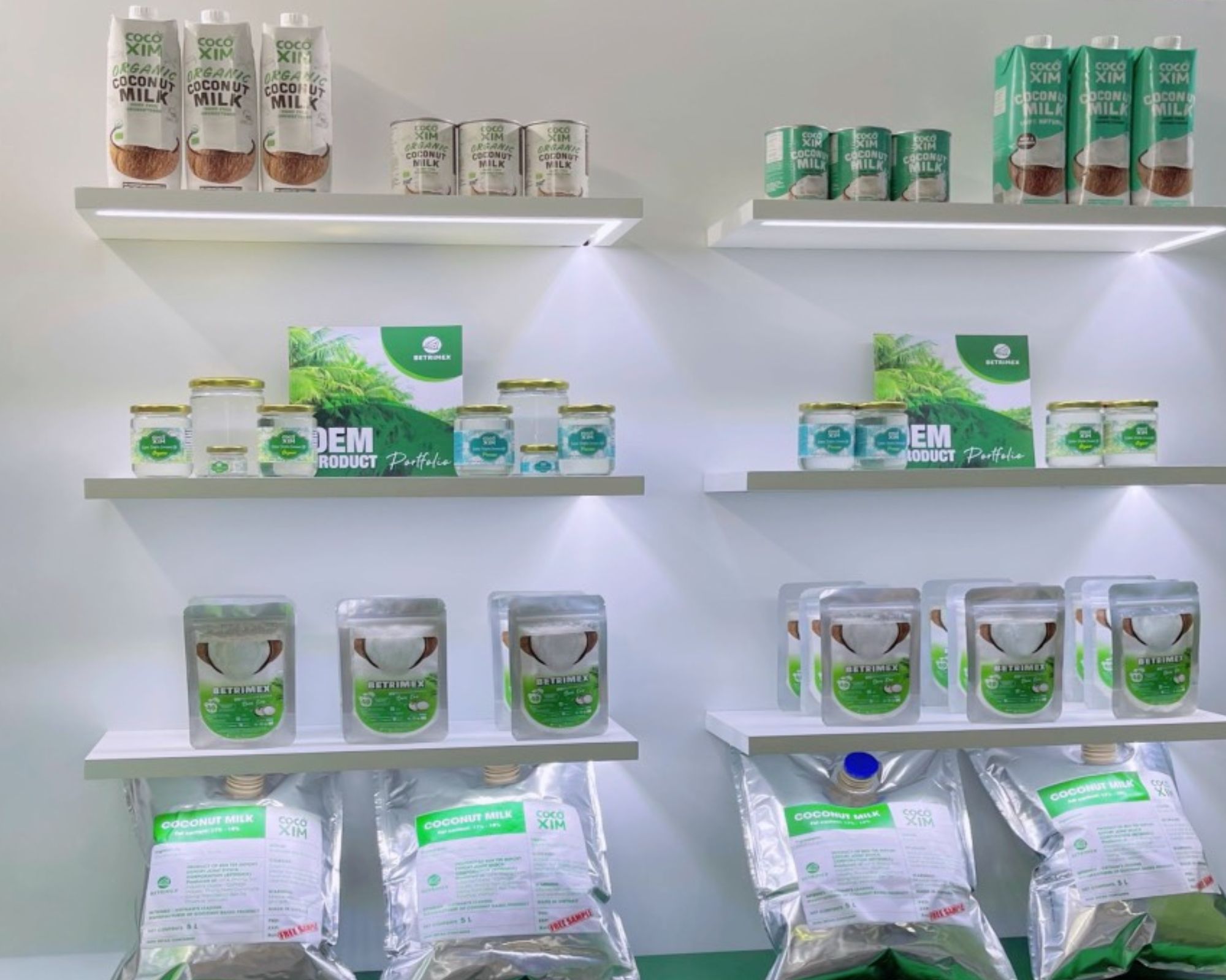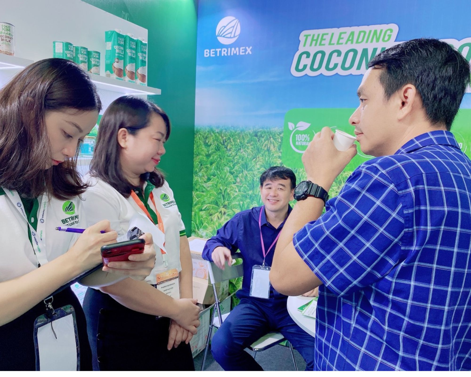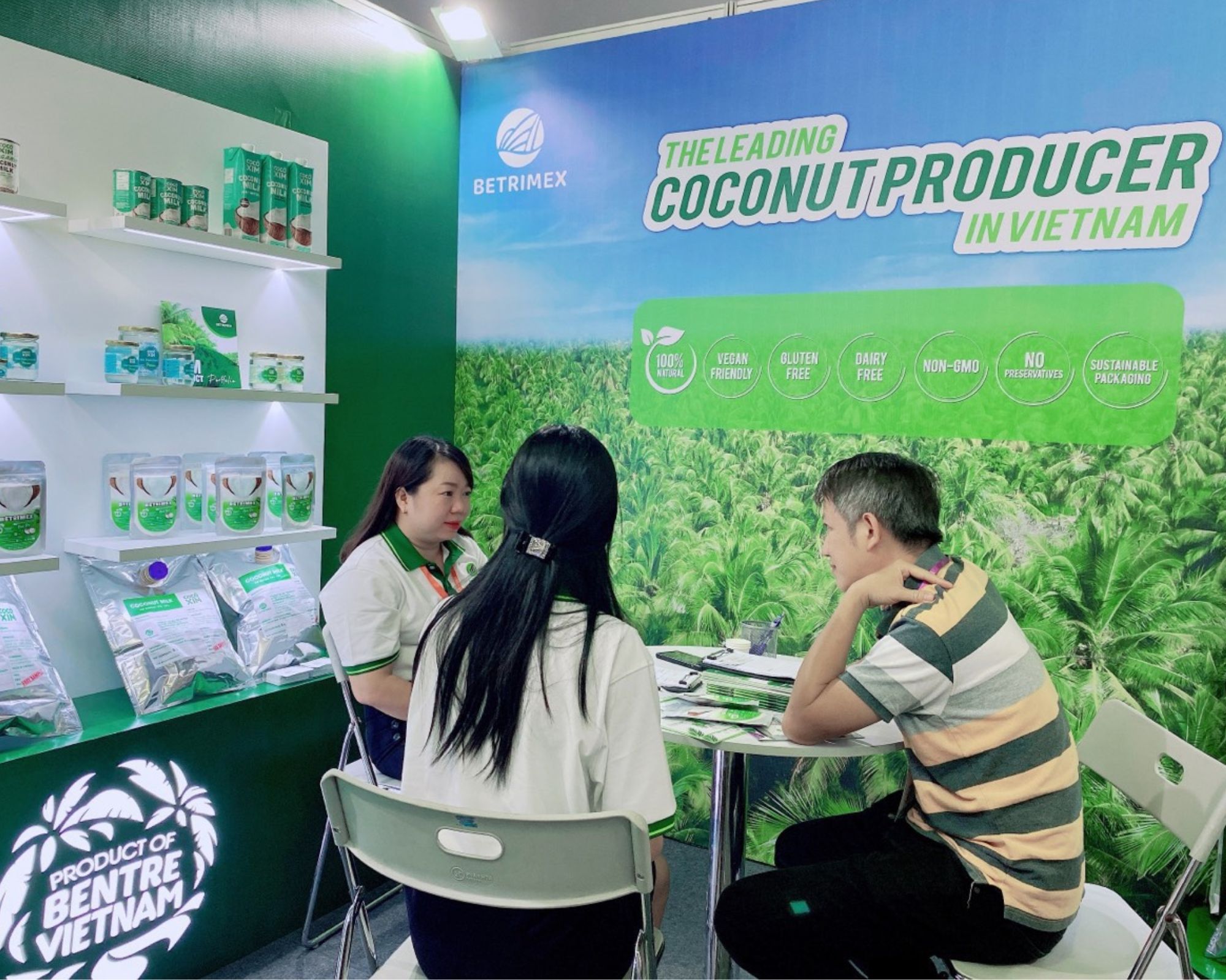 Gian hàng Betrimex được thiết kế hiện đại, lấy cảm hứng từ sắc xanh tươi mát của xứ dừa Bến Tre, cùng các sản phẩm chất lượng, sáng tạo dành cho ngành công nghiệp chế biến như nước cốt dừa, dầu dừa, cơm dừa sấy khô… đã nhanh chóng nhận được sự quan tâm của đông đảo các đối tác và chuyên gia trong ngành.