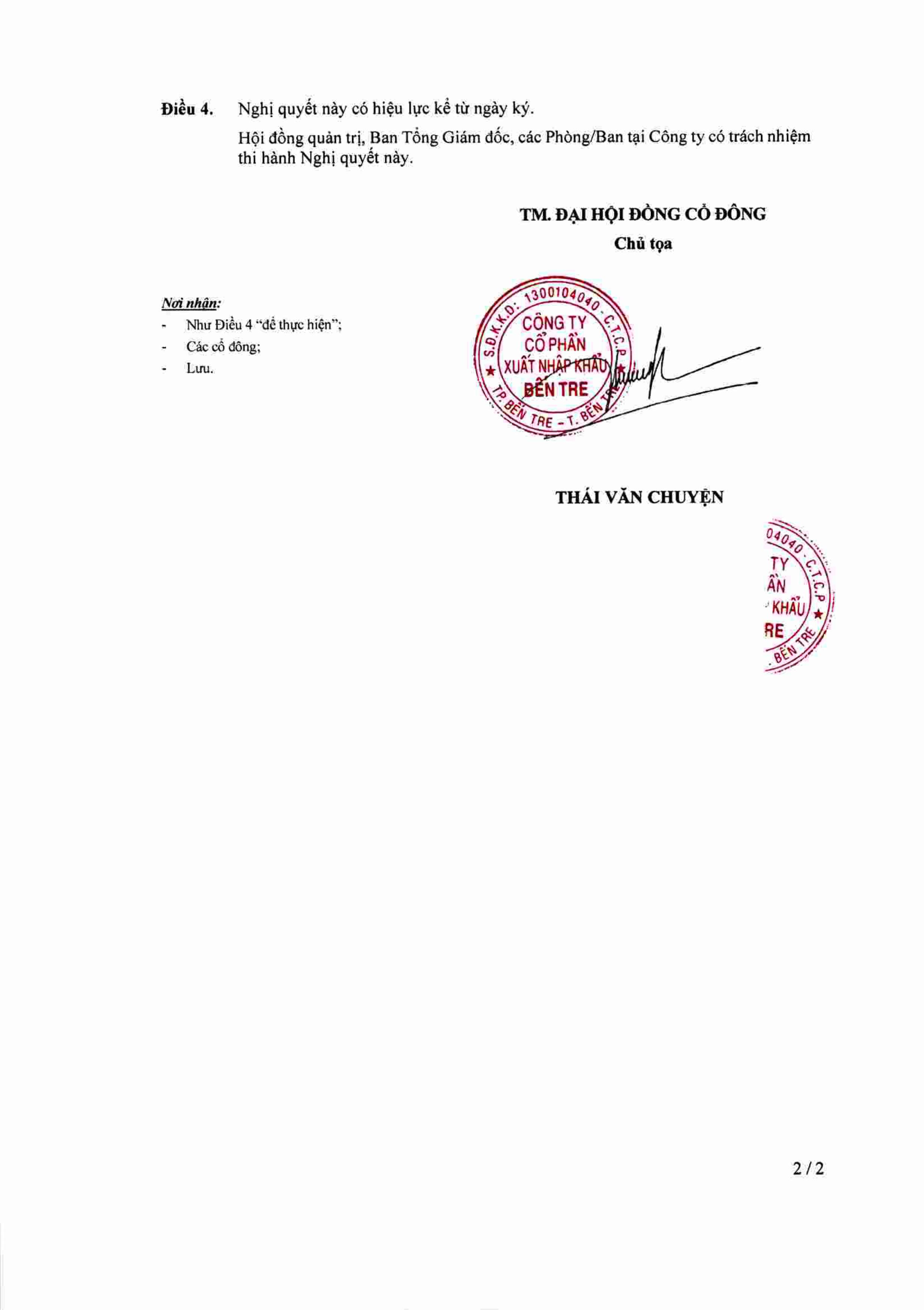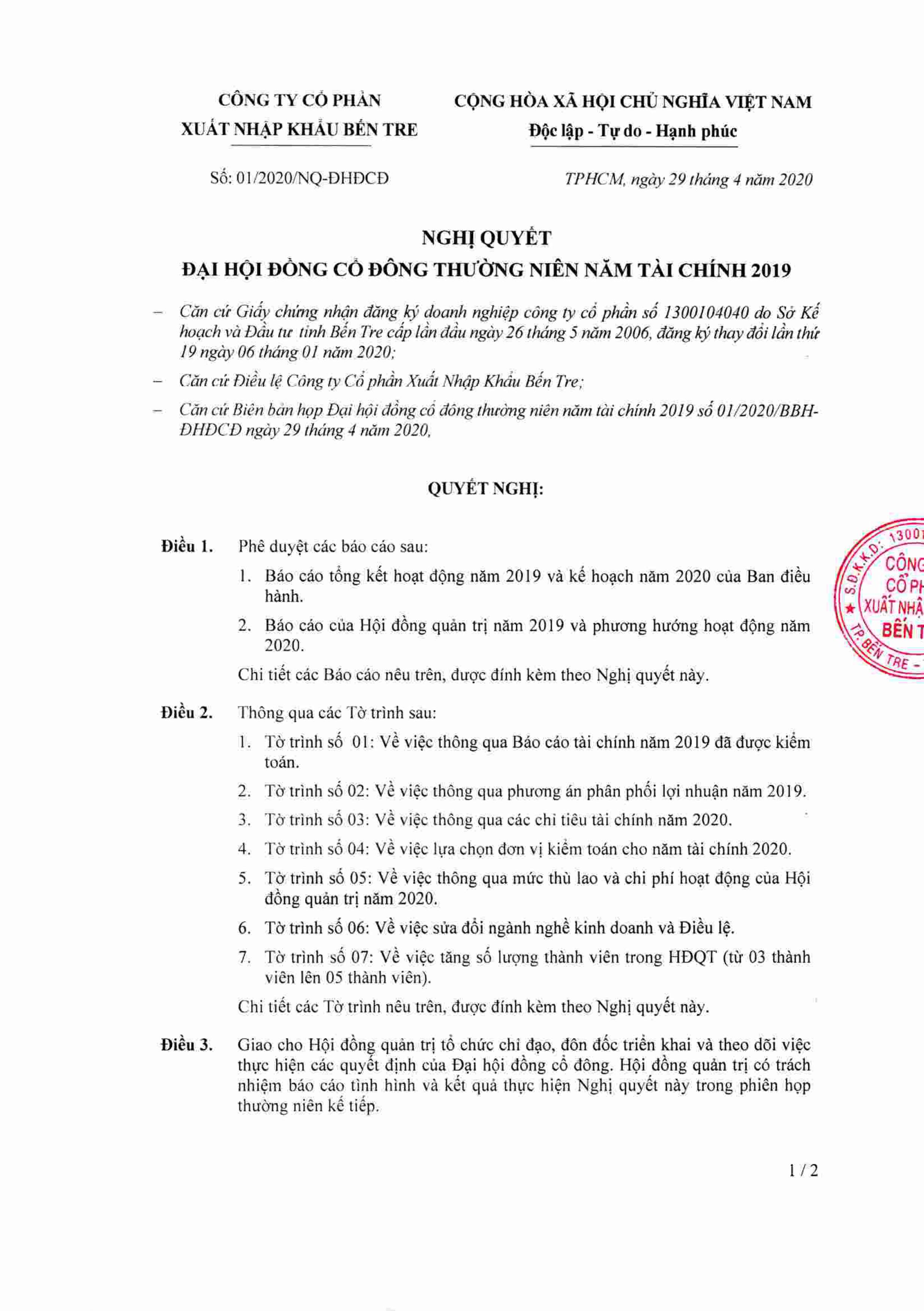 Nghị quyết ĐHĐCĐ năm tài chính 2019 của Công ty CP XNK Bến Tre