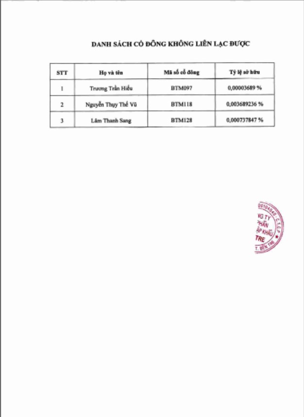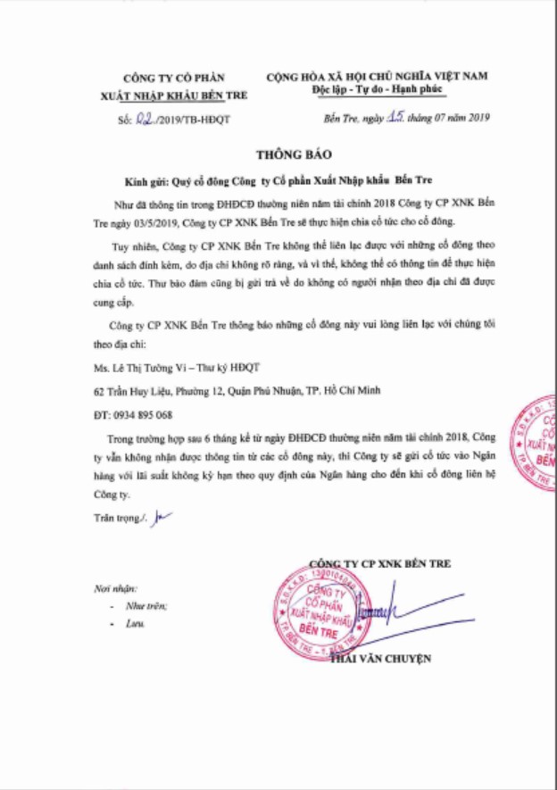 Công ty Cổ phần Xuất Nhập khẩu Bến Tre trân trọng gửi Thông báo chốt danh sách cổ đông cho ĐHĐCĐ 2024.