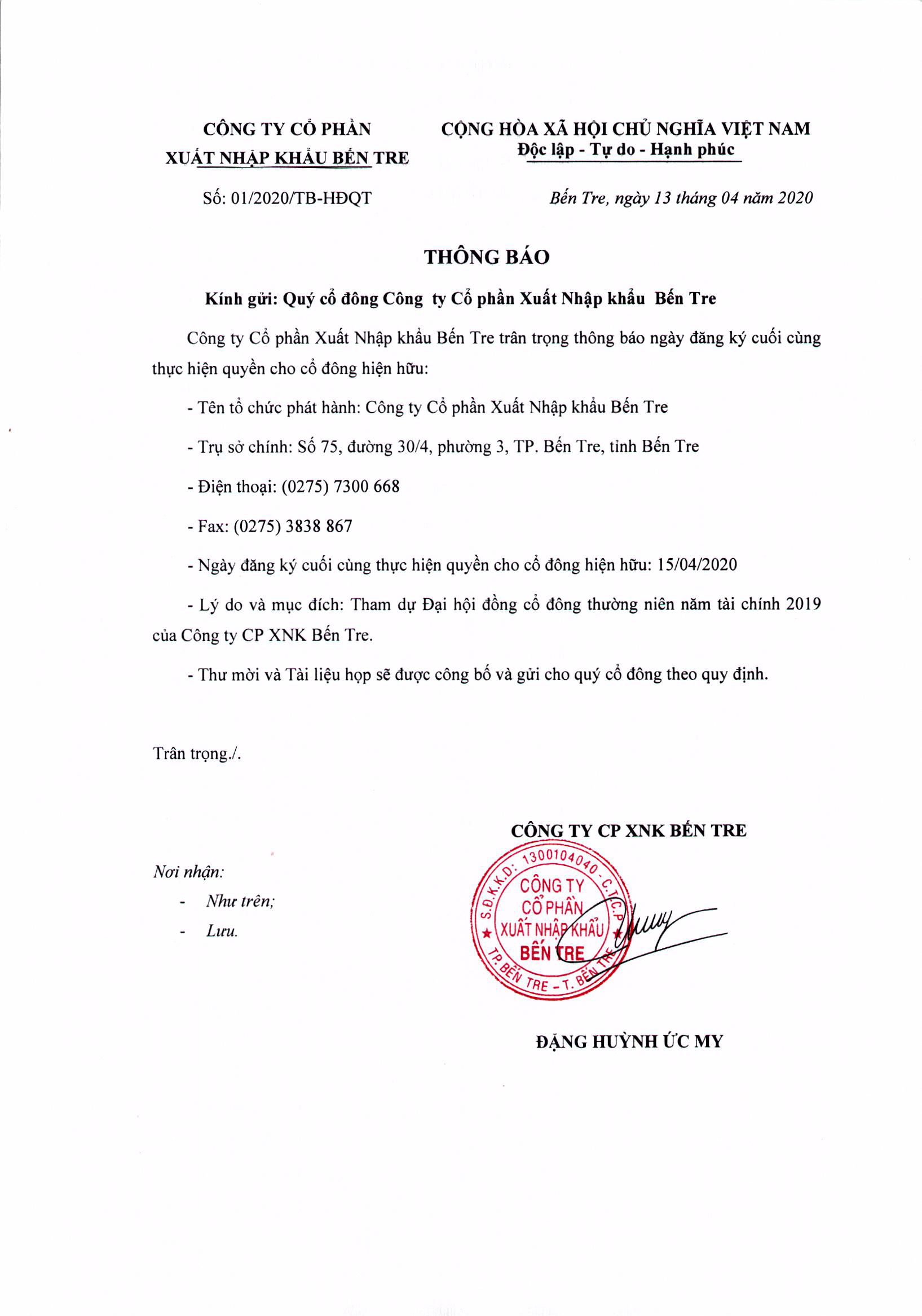 Thông báo ngày đăng ký cuối cùng thực hiện quyền cho cổ đông hiện hữu, để tham dự ĐHĐCĐ thường niên năm tài chính 2019 của Công ty CP XNK Bến Tre.