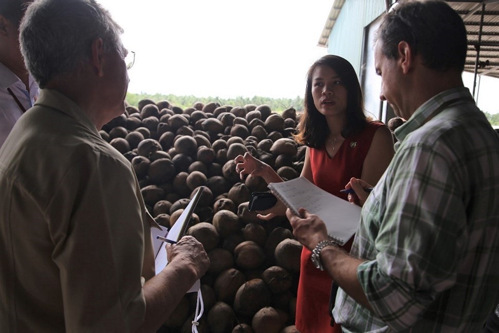 Đại diện Betrimex đưa đoàn đại biểu Qũy Phát triển Nông nghiệp Quốc tế thăm quan khu Sơ chế dừa của Nhà máy Thành Thành Công của Betrimex tại Bến Tre