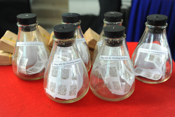 Tại đây, mọi người được hướng dẫn sử dụng ong ký sinh mắt đỏ (Trichogramma sp) - giải pháp phòng trừ sâu sinh học của công ty Betrimex và Trung tâm Nghiên cứu Ứng dụng Mía đường TTC (SRDC).