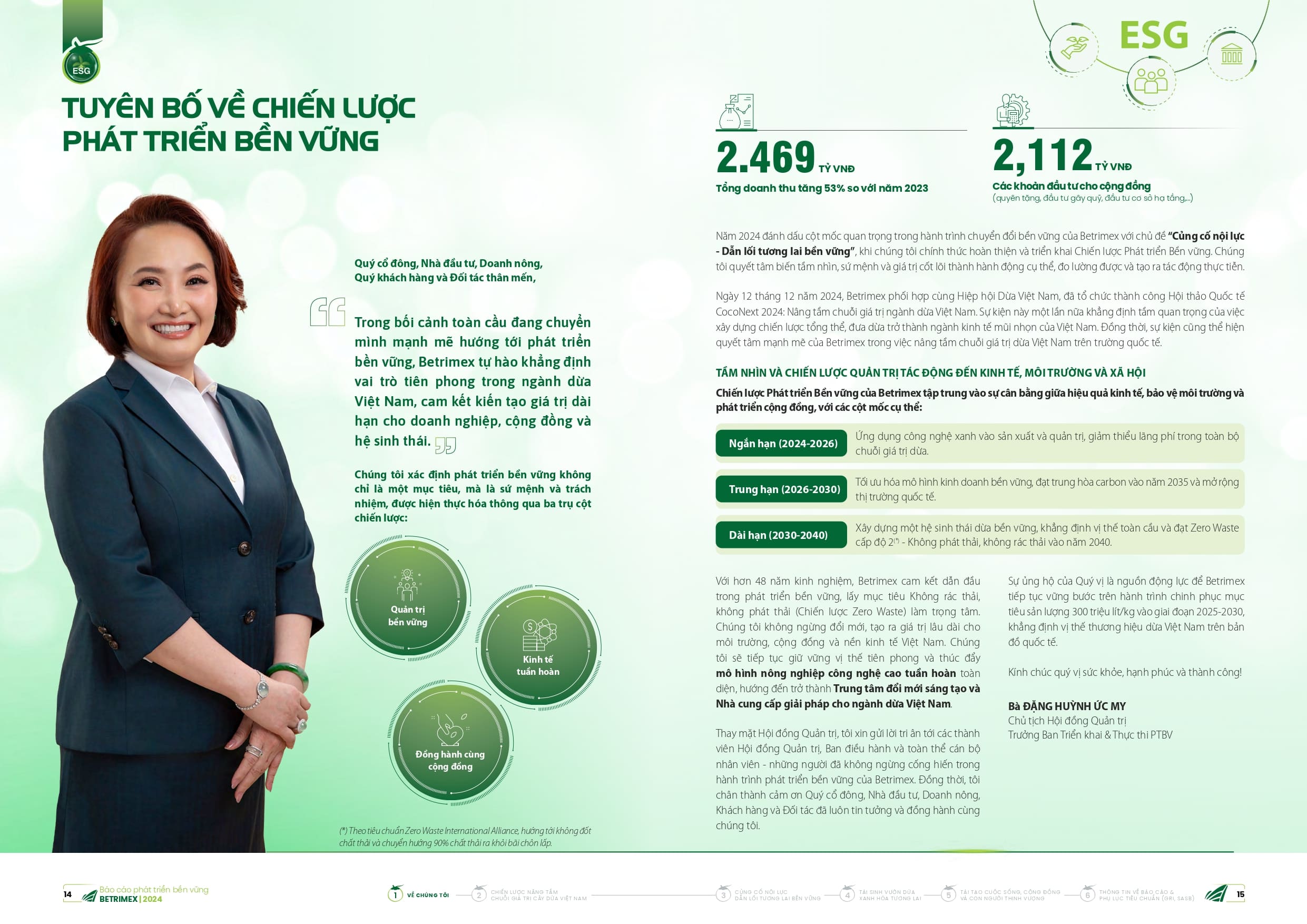 Betrimex tin rằng: Củng cố nội lực vững chắc hôm nay chính là nền tảng để doanh nghiệp, cộng đồng và xã hội cùng vươn tới một tương lai thịnh vượng, bền vững và đầy hy vọng. Với Báo cáo PTBV 2024, chúng tôi cam kết tiếp tục đồng hành cùng khách hàng, đối tác, người nông dân và cộng đồng để lan tỏa giá trị Việt Nam, nâng tầm chuỗi giá trị dừa trên thị trường quốc tế.