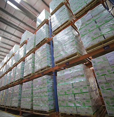 Diện tích lắp kệ khoảng 5,000 m2. Số vị trí kệ hơn 4,000 pallets. Sức chứa: 3 triệu lít thành phẩm