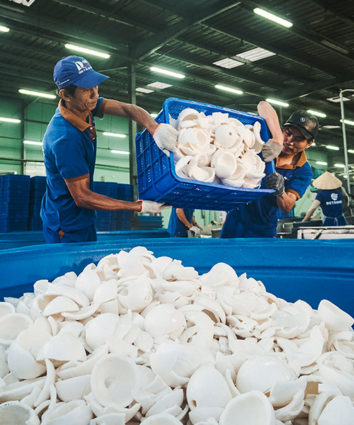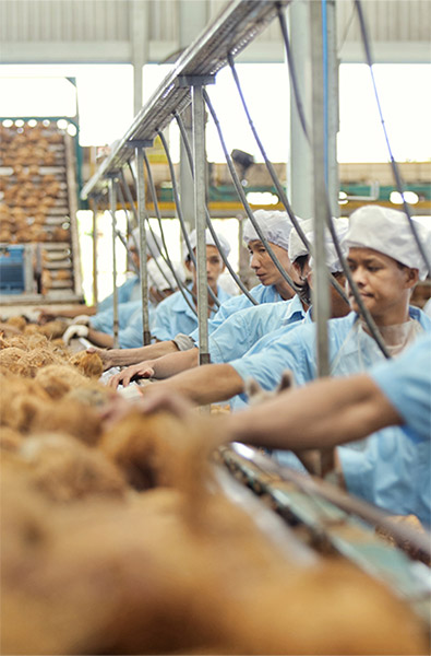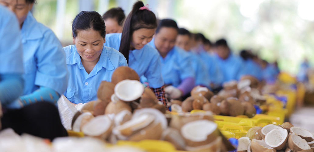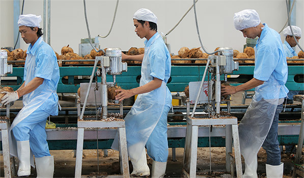工人将棕色果壳中去掉,清洗并准备生产其他产品如:椰奶,干椰子肉,椰子油和椰子汁。
