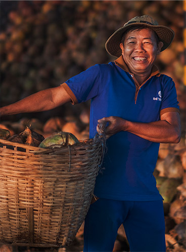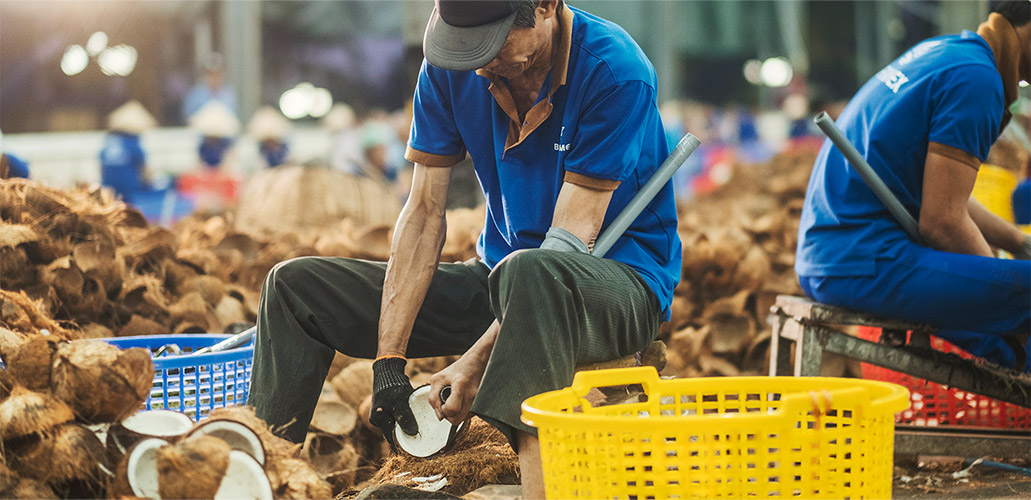 首先,由熟练的Betrimex工人将椰子去皮,然后钻小孔中取水。较快地钻一个小孔有助于椰子水不漏出,同时比手工切割椰子更好地限制了残留物。